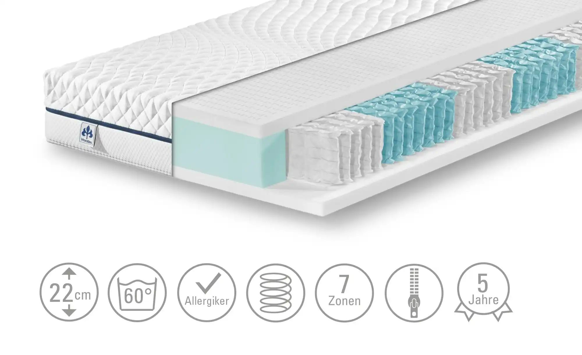 Unser Produkt IRISETTE 7-Zonen-Tonnentaschenfederkernmatratze Cuba 22 TTFK gibt es in den Farben: weiß Der Hersteller IRISETTE ist bekannt für die hohe Qualität der verwendeten Materialien. Maße: · Breite: 180 cm · Höhe: 22 cm · Prüfsiegel: Öko-Tex Standard 100 · Aktion: Newsletter-Anmeldung 10€ Willkommens-Gutschein. · Der Artikel befindet sich in der Höffner-Kategorie: Matratzen & Zubehör – Matratzen-Arten – Federkern-Matratzen.